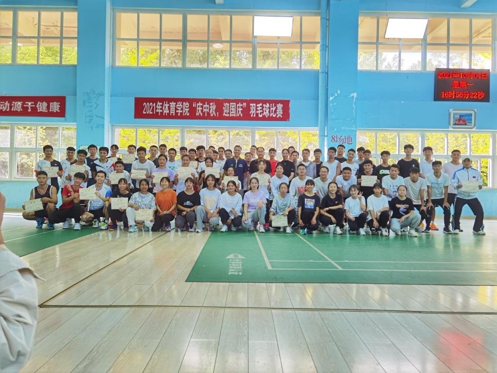 2021年10月4日下午16:30,玉溪师范学院体育学院“庆中秋,迎国庆”羽毛球比赛在羽毛球馆圆满落下帷幕。出席本次颁奖仪式的领导嘉宾有:体育学院党委书记杨志龙老师、体育学院党委副书记董丽波老师、体育学院副院长雷小明老师、体育学院辅导员吕刚老师、体育学院辅导员董诗稳老师。