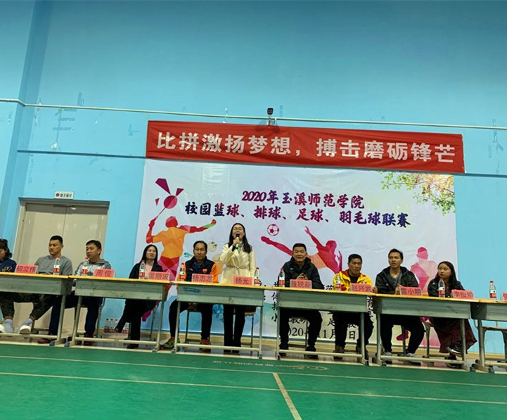 2020年11月2日,由共青团玉溪师范学院委员会主办,玉溪师范学院体育学院团委、公体教研室、篮足排小球教研室承办的2020年玉溪师范学院校园篮球、排球、足球、羽毛球联赛在训练馆隆重开幕,杨光副校长、聂锐新院长、杨志龙学院党委书记等相关人出席开幕式。