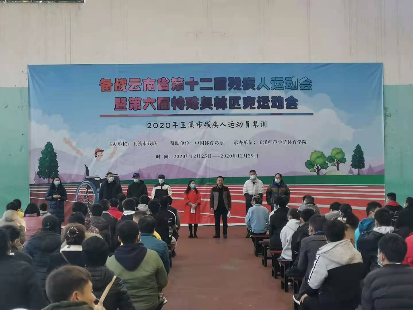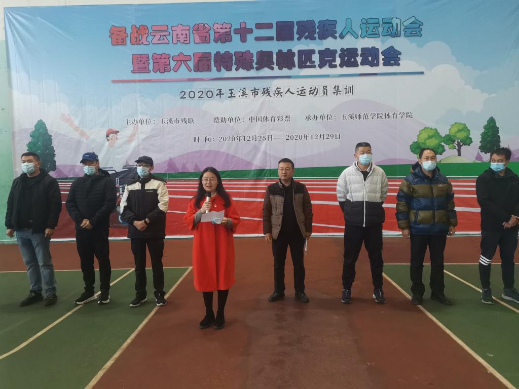 2020年12月26日,在学校风雨管举行2020年玉溪市残疾人运动员集训动员会,体育学院副院长普春旺主持,副校长杨光、玉溪市残联副理事长金忠武、体育学院院长聂锐新、体育学院党委书记杨志龙、云南省体育中心教练宋柏德及六县两区的运动员,参加此次集训动员。