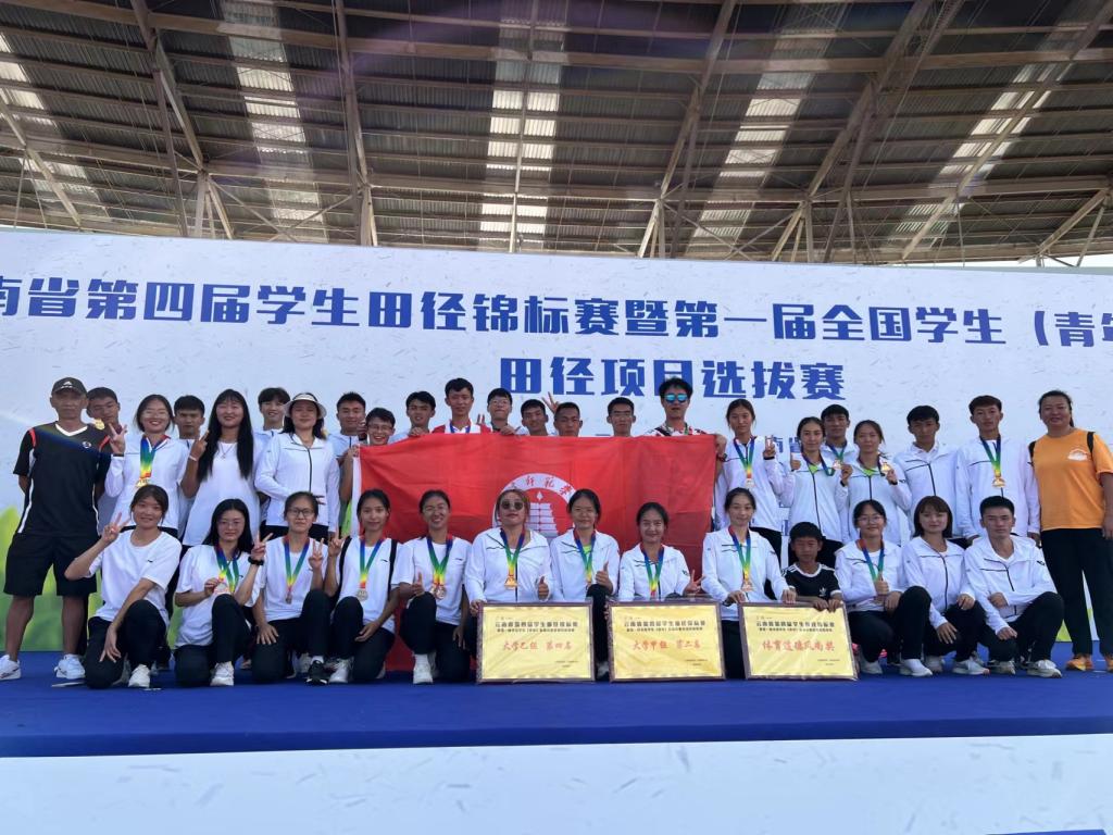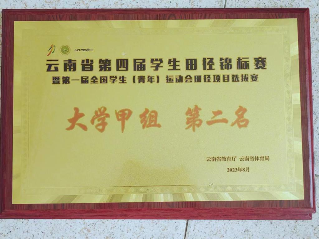 由云南省教育厅、云南省体育局主办, 普洱市教育体育局承办的云南省第四届学生田径锦标赛暨第一届全国学生(青年)运动会田径项目选拔赛于2023年8月16—20日在普洱市万人体育场举行,我校体育学院彭安权、董珍等25名同学在教练李俊恒、李学东、赵艳艳、白银龙带领下参加了本次赛事大学甲组(体育专业学生)的比赛,该组别共有18所院校参赛。经过三天的激烈角逐,我校田径队获6金4银5铜、5个第四名、5个第五名、4个第六名、4个第七名、4个第八名,团体总分第二名。赵艳艳荣获“优秀教练员”称号,彭安权、董珍荣获“优秀运动员”称号。