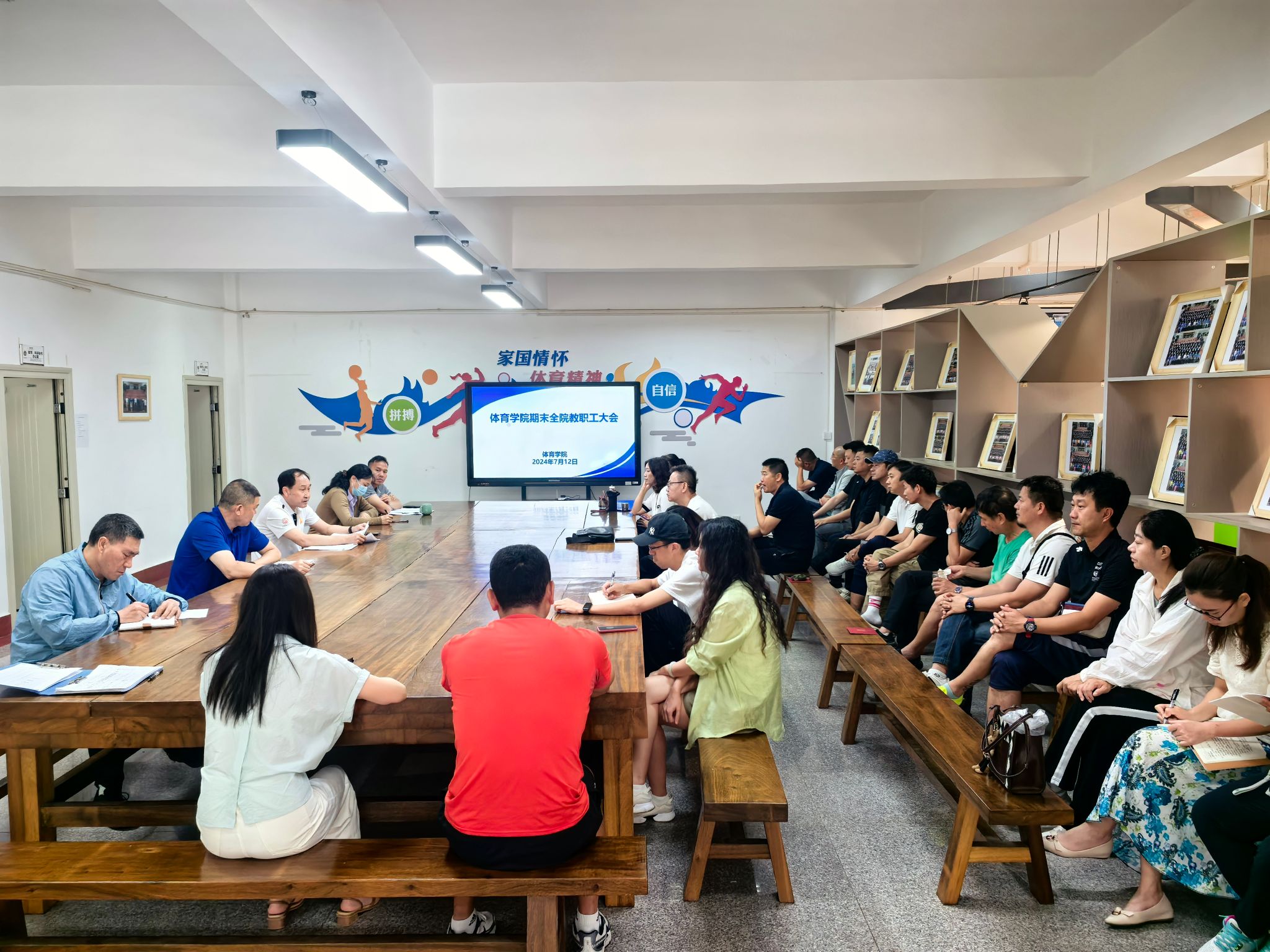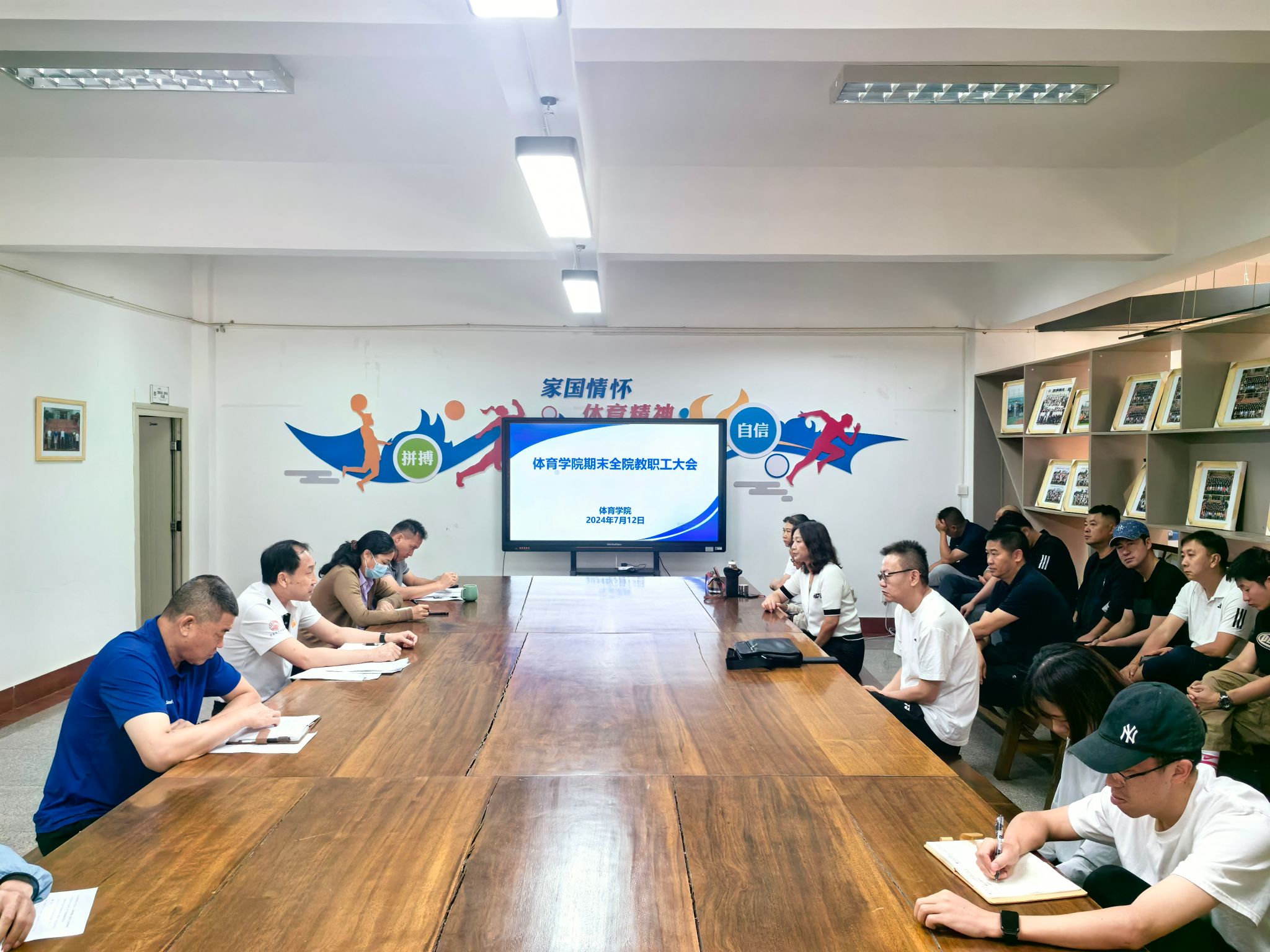 2024年7月12日上午9:00分在体育学院办公区,召开体育学院期末全院教职工大会,会议由聂锐新院长主持,全体教职工参加本次大会。