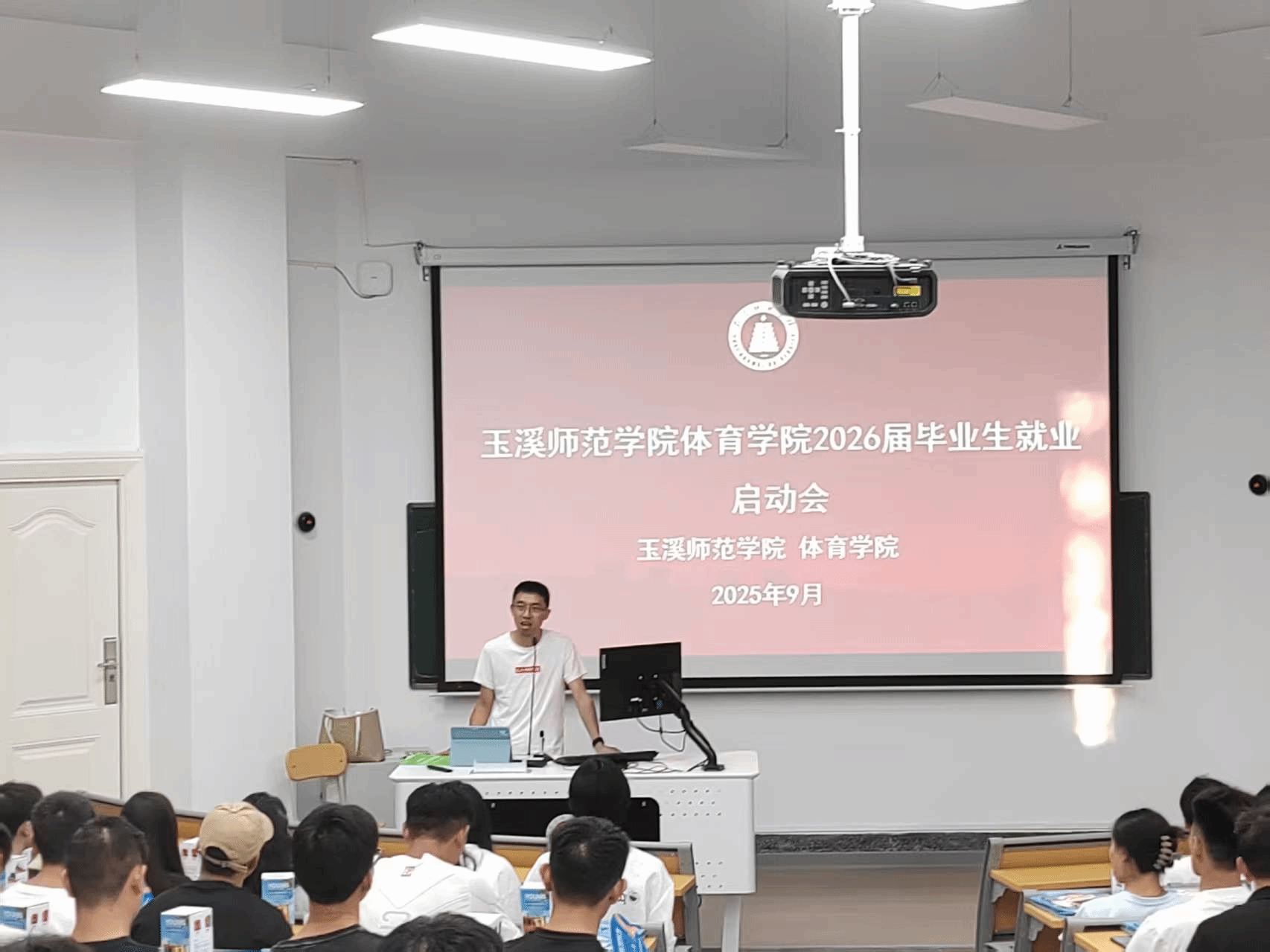 2025年9月4日晚19点,体育学院在7教博思馆隆重召开了2026届毕业生就业启动会,标志着学院正式拉开新一年度毕业生就业工作的序幕。学院教师董诗稳、李方辉、毕业班班主任及2026届毕业生参加了此次会议。