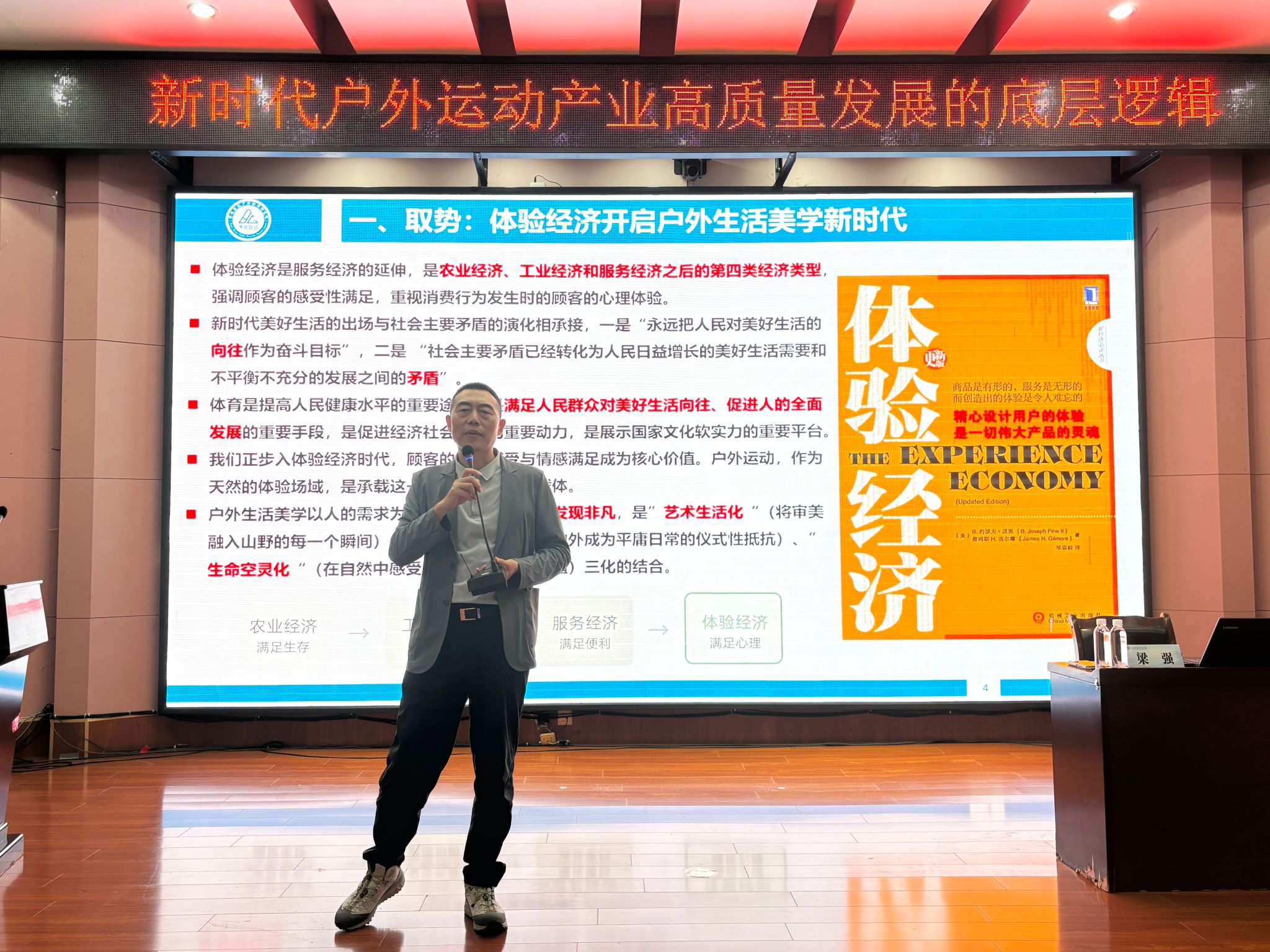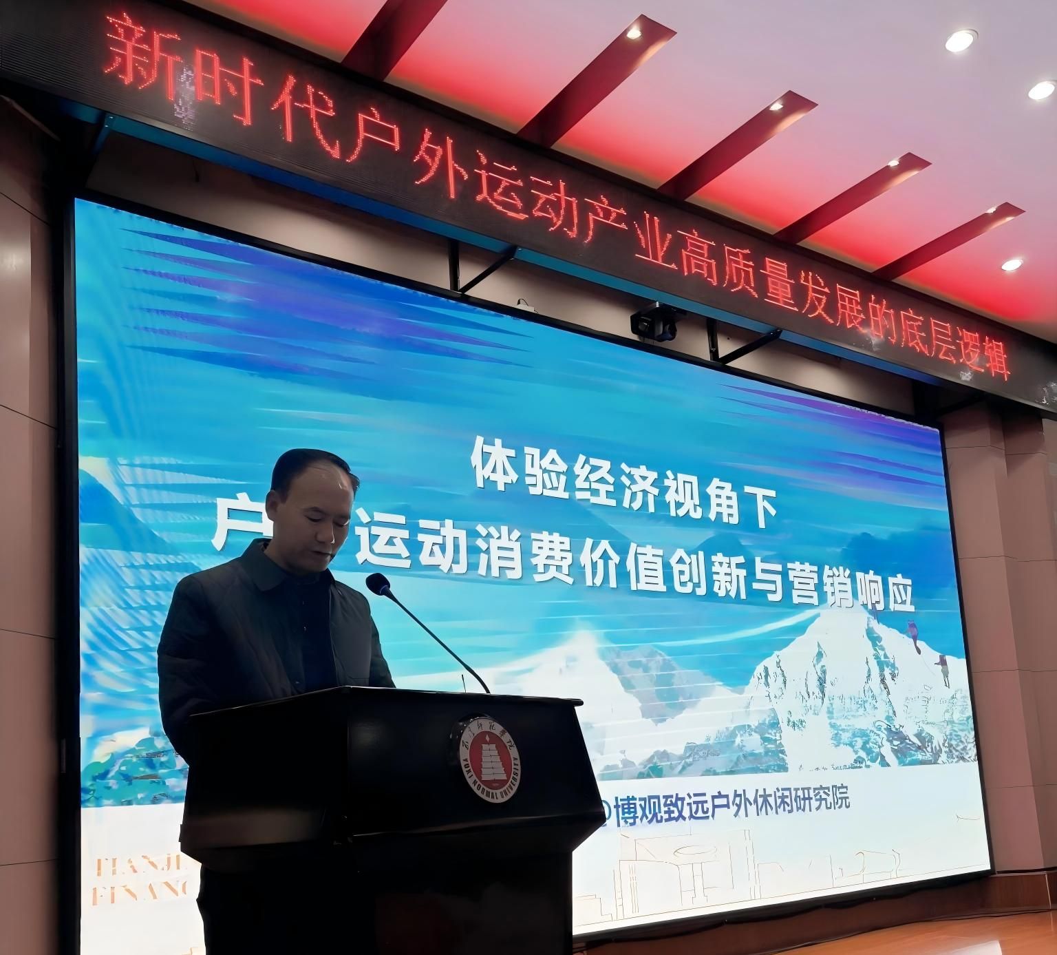 在热烈的掌声中,梁教授以“取势、明道、优术”的逻辑框架,系统阐述了体验经济时代下户外生活美学的发展路径。首先“取势”,指出我国正从服务经济迈向体验经济,体育产业也已跨越到注重质量效益的高质量发展新阶段,这使得承载着“回归自然、挑战自我”本能需求的户外运动,成为开启“户外生活美学”新时代的核心载体。继而“明道”,他深入剖析当代户外消费已裂变为功能、体验、情感三个层次,户外运动作为对单调日常的“仪式性抵抗”,其疗愈心理、强化社交的多元情感价值成为产业供给侧改革的关键锚点。最后,他聚焦“优术”,提出通过构建一个整合了知识、体验、场景、事件及跨界营销的立体响应矩阵,将户外“奇伟瑰怪”的独特资源与多元游憩需求有效组合,最终才能实现“对的内容在对的场景里产生对的效果”,为户外运动目的地的产品创新与场景营造提供了极具操作性的方法论。