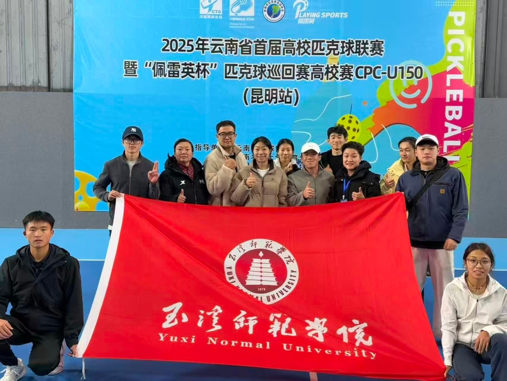 2025年12月26日至28日,2025年首届高校匹克球联赛CPC-U150于昆明圆满落幕。玉溪师范学院体育学院代表队在领队许海峰老师,教练员杨林枫、申冬玉老师的联合带领下,师生同心协力、奋勇拼搏,在赛事中斩获多项佳绩——教师组勇夺女子双打冠军、男女混合双打亚军、男子双打亚军;学生组收获女子双打冠军、女子单打亚军、混合团体亚军,此外还拿下混合双打第五名、男子双打第五名的优异成绩,尽显玉师体育人的专业风采与竞技实力。