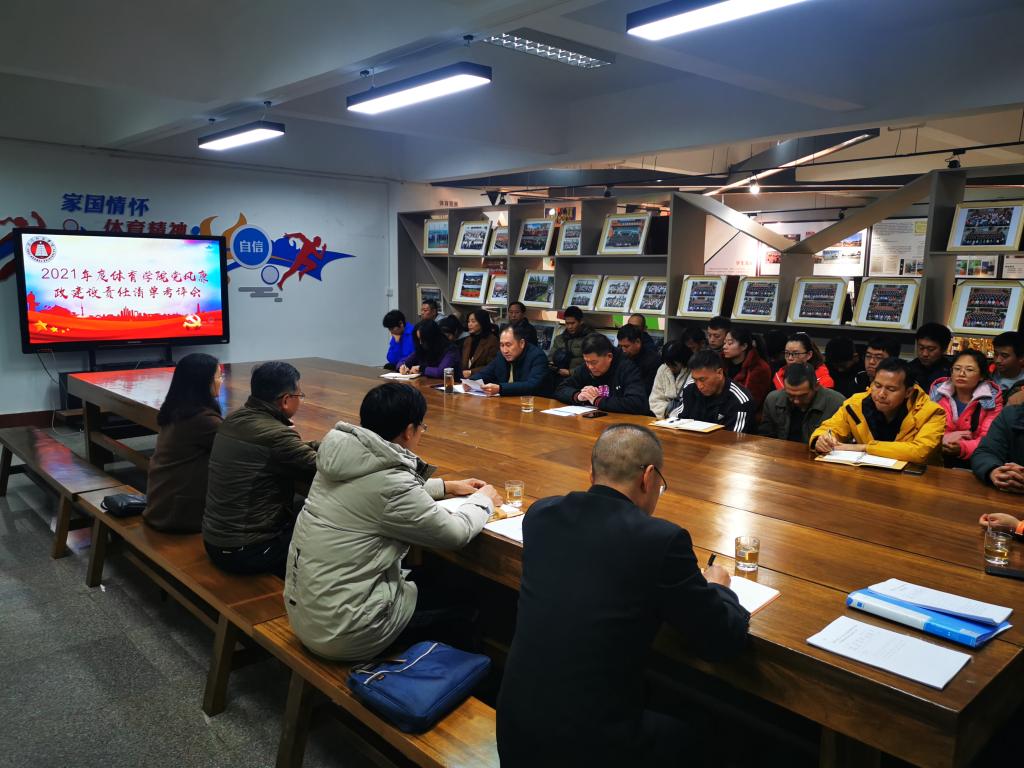 2021年11月25日晚7:30,在体育学院办公区召开了2021年度体育学院党风廉政建设责任考评会,参加本次考评会的有学校党委委员、副校长杨光,纪委巡察办主任、考核组组长彭松,考核组成员张伟、蔡咏明及体育学院全体教职工,会议由体育学院院长聂锐新主持。