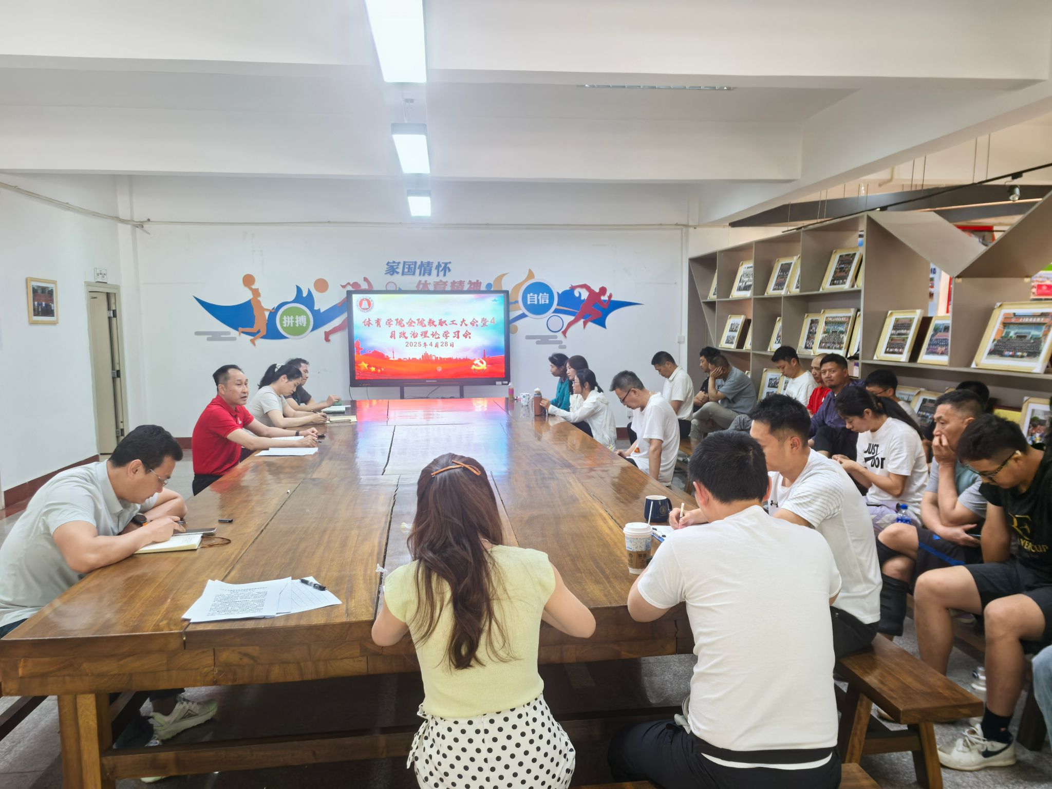 2025年4月28日下午,在体育学院办公区召开教职工大会暨4月政治理论学习会,党委书记杨志龙主持会议,学院全体教职工参加专题学习会。